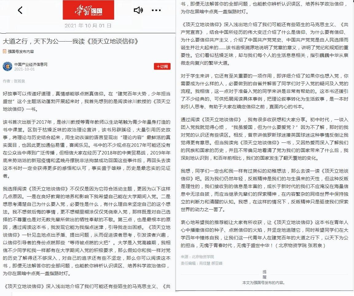 10月1日,由永利3044noc21级员工张若泉参加院级新生读书报告会所提交的读后感《大道之行,天下为公——我读< 顶天立地谈信仰>》在“ 学习强国 ” 平台中的中国产业经济信息网发表,并被刊登在学校官网中。