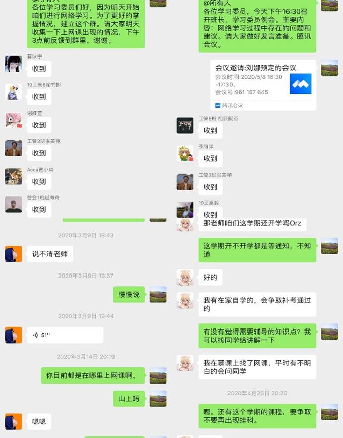 各个班级也集合自身班级情况,召开以“云端模式下如何更好地开展学习”为主题班会。同学们互动积极,既指出自身存在的问题,又针对问题提出了意见和建议,制定切实可行的方案,如进行课堂笔记共享、建立班级学习互助小组、推选“云端”学习标兵、学习经验分享等。通过行动,加强学风班风建设,以学促建,以学聚力,保证线上学习效果,提高线上学习效率,真正做到。