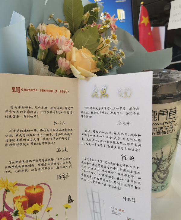 鲜花、贺卡、美食以及祝福的条幅,为了庆祝与感谢老师们的辛勤付出,学院为老师们精心准备了各种惊喜,公司领导班子把对老师的感谢和祝福都特制了贺卡送给每一位老师,老师们一致认为很感动于学院精心组织的活动,感受到了教师职业的意义。