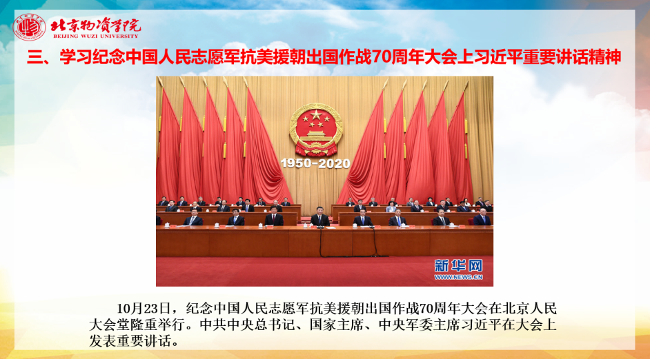 随后张乐同学带领大家学习了习近平总书记在纪念中国人民志愿军抗美援朝出国作战70周年大会上的重要讲话。在讲话中,习近平总书记全面回顾总结了抗美援朝战争的伟大胜利和巨大贡献,深刻阐述了抗美援朝精神的历史意义和时代价值,精辟揭示了抗美援朝战争的历史启示,郑重宣示了捍卫国家领土主权和统一、维护地区和世界和平稳定、推动构建人类命运共同体的坚定立场和决心。