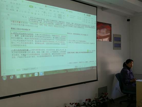 陈娟副经理首先从国家对于提高上市公司质量的制度梳理切入,仔细讲解了如下制度出台的背景及相互关联的关系:2004年1月31日《国务院关于推进资本市场改革开放和稳定发展的若干意见》、2005年10月19日《国务院批转证监会关于提高上市公司质量意见的通知》、十九大、2017年10月18日至10月24日《决胜全面建成小康社会 夺取新时代中国特色社会主义伟大胜利》、十九届二中全会、2018年1月审议通过的《中共中央关于修改宪法部分内容的建议》、十九届三中全会、2018年2月审议通过的《中共中央关于深化党和国家机构改革的决定》、《深化党和国家机构改革方案》、十九届四中全会、2019年10月审议通过的《中共中央关于坚持和完善中国特色社会主义制度、推进国家治理体系和治理能力现代化若干重大问题的决定》、2020年10月发布的《国务院关于进一步提高上市公司质量的意见》等,挖掘出科研课题,公司产品和公司产品三部分的具有非常重要价值的内容。