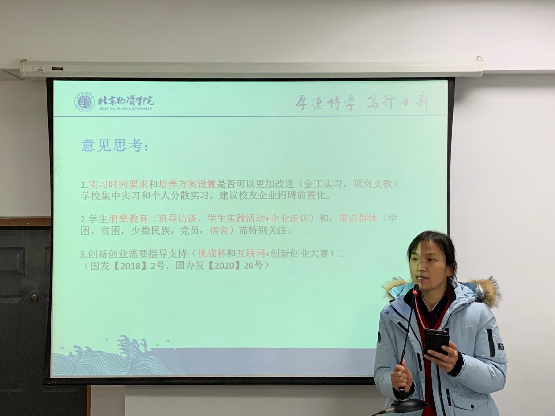 随后,教学副经理陈娟分析介绍近期毕业年级学业注意事项。她指出,提升教学质量是保证就业质量的基础,各专业主任要牵头做好选课指导,从大一至大四分阶段做好培养方案的制定,班主任要做好学业完成情况统计,关注学业困难员工并做好帮扶。