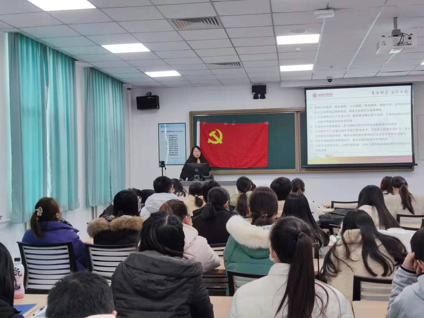 此次理论学习主要是党的十九届五中全会精神的学习,施雯、于佳琪、韩竹三位同学分别从会议召开的背景、我国发展环境面临的变化、未来发展愿景等方面详细介绍了我国决胜全面建成小康社会取得的决定性成就、“十四五”时期经济社会发展的六大目标以及实现奋斗目标十二个方面的具体举措,对十九届五中全会精神做了全面导读。
