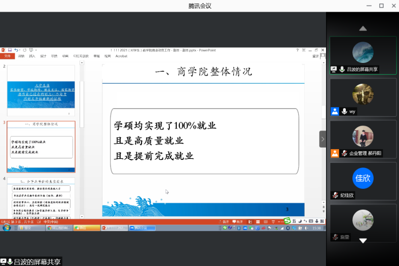 为帮助2021届研究生顺利毕业和就业,3月18日下午,永利3044noc举办了2021届研究生毕业工作促进会,会议以腾讯会议的形式展开,学院经理吕波、辅导员王洋和全体2021届研究生毕业生参加了会议。