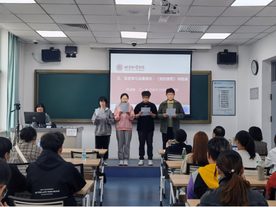工商五班班长王一卓介绍班级基本情况以及近期班级同学的党史学习教育情况。随后班级员工展示了党史学习教育成果。艾克染木江同学结合自身实际,讲述了在中国共产党的领导下,中国从旧时代走向民主富强的变化,表达了自己对党的认识与热爱。由王一卓、范俊杰、刘余薇、张思宇四名同学带来朗诵《党的赞歌》。历经几十年的沧海桑田,中华儿女也在党的领导下不断蜕变。在场的同学们伴随着激情澎湃的朗诵声,似乎也沉浸在回顾历史的长河中。与会领导对同学们学党史的热情和成果表示了肯定。