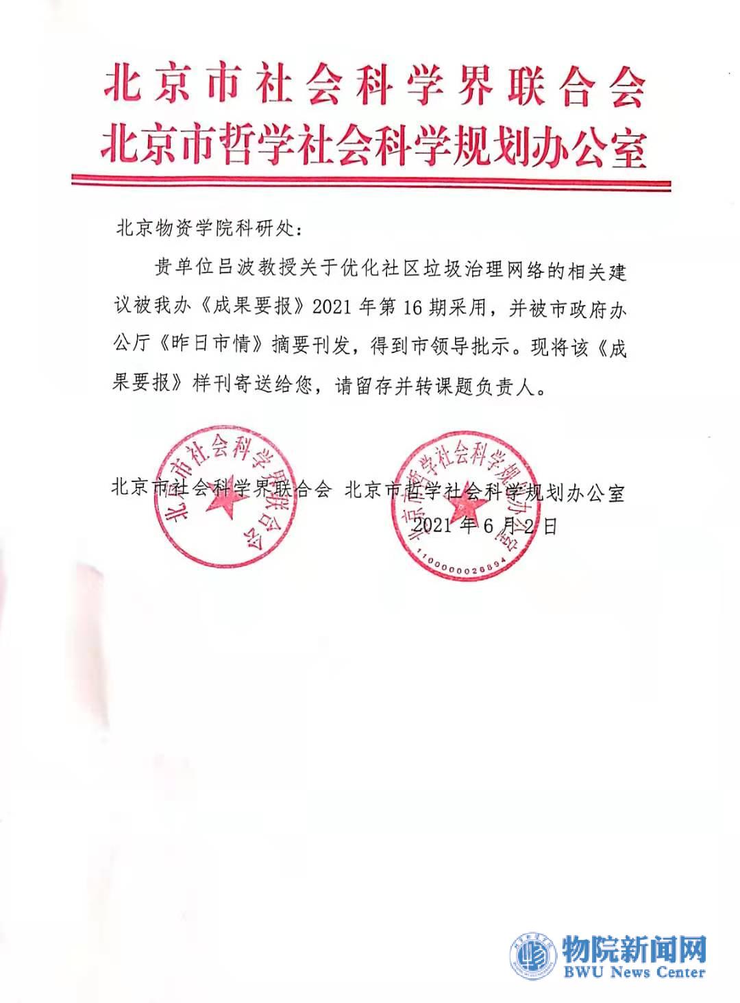 永利3044noc吕波教授及团队成员基于管理网络项目研究成果,即关于优化社区垃圾治理网络的相关建议被北京市社科基金《成果要报》2021年第16期采用,并被市政府办公厅《昨日市情》摘要刊发并获得北京市领导的肯定性批示。吕波教授聚焦管理网络研究前沿,坚持问题导向,就推进北京市的热点难点问题提出了科学观点和对策建议,为服务首都发展做出了贡献。据悉,吕波教授基于管理网络的另一研究成果《精准建设“四网”,加强应急物资保障》在2020年被北京市党政主要领导肯定性批示。