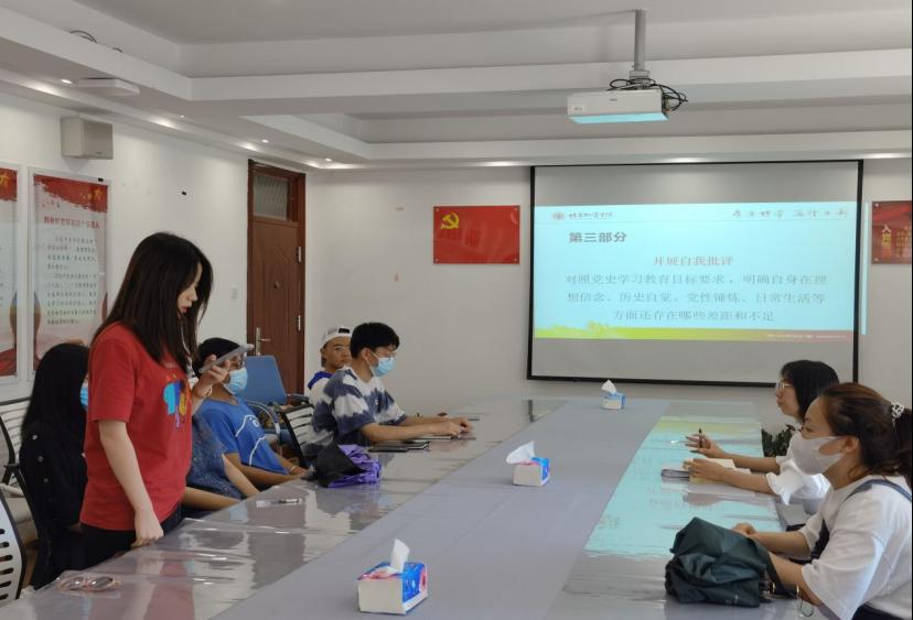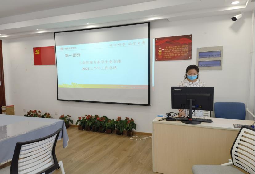 第一个会议议程是由工商管理员工党支部副书记杜欣谊同学代表本支部进行2021年度上半年的党建工作汇报。截止2021年7月,其中已有20名员工党员毕业,现共有员工党员19名,其中预备党员19名;在此期间我们深入开展理论学习,主要围绕了全国老员工党史知识竞赛大赛活动、“我听亲人讲四史”、线上“党史云答题”、“每月一测”活动等展开,深入学习贯彻习近平新时代中国特色社会主义思想,全面落实立德树人根本任务,大大提高了党员的党性修养;同时,我们丰富党建形式,开展支部特色活动。我们开展了两次实践活动,分别组织去通州区平家疃村和去军事博物馆的党带团活动;和一次微党课展示活动,进行演讲,多名预备党员参与视频录制和准备工作中。这对党员精神及党性修养的提升有很大促进作用。