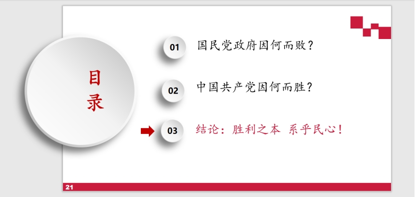 第三部分是对以上内容进行总结以及课堂延伸。综合从国民政府以及中国共产党这不同两个层面客观分析,我们可以得到“胜利之本,系乎民心”的结论,这也是中国共产党为什么可以胜利的最主要原因。“以人民为中心是中国共产党的根本政治立场”作为课后思考内容;并以“习近平:在庆祝中华人民共和国成立70周年大会上的讲话”、“习近平:在庆祝中国共产党成立100周年大会上的讲”、《中国人民政治协商会议共同纲领》以及金一南:《苦难辉煌》,作为延伸阅读推荐分享。中国共产党赢得了民心!只有为人民谋幸福、为民族谋复兴的党才能取得革命的胜利,那就是中国共产党。