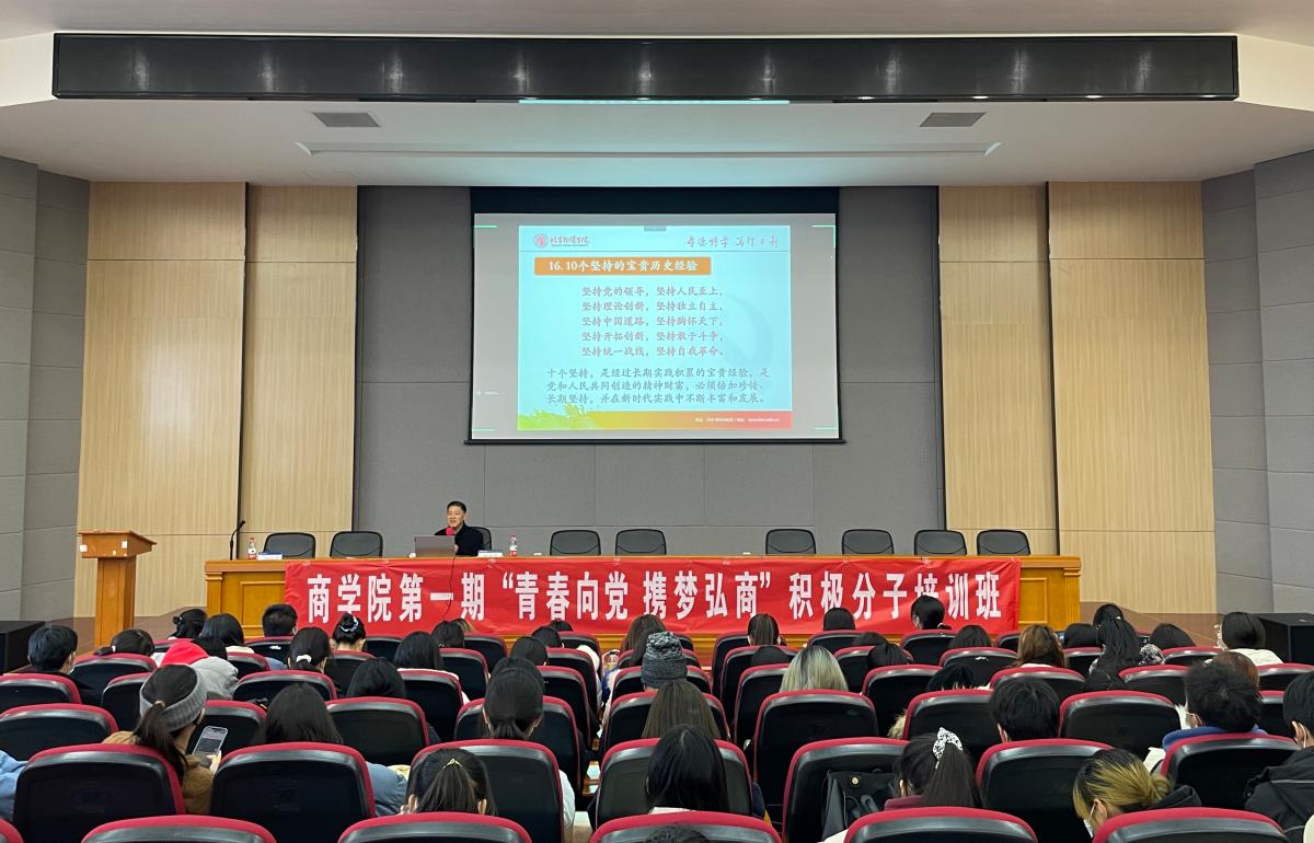 2021年11月24日,永利3044noc第一期“青春向党 携梦弘商”积极分子培训班于国交二层报告厅开班。本次入党积极分子培训班由党委书记魏国辰教授主讲,92名积极分子佩戴口罩线下参会,80名积极分子于腾讯会议参会。培训班由辅导员杨柳依依主持。
