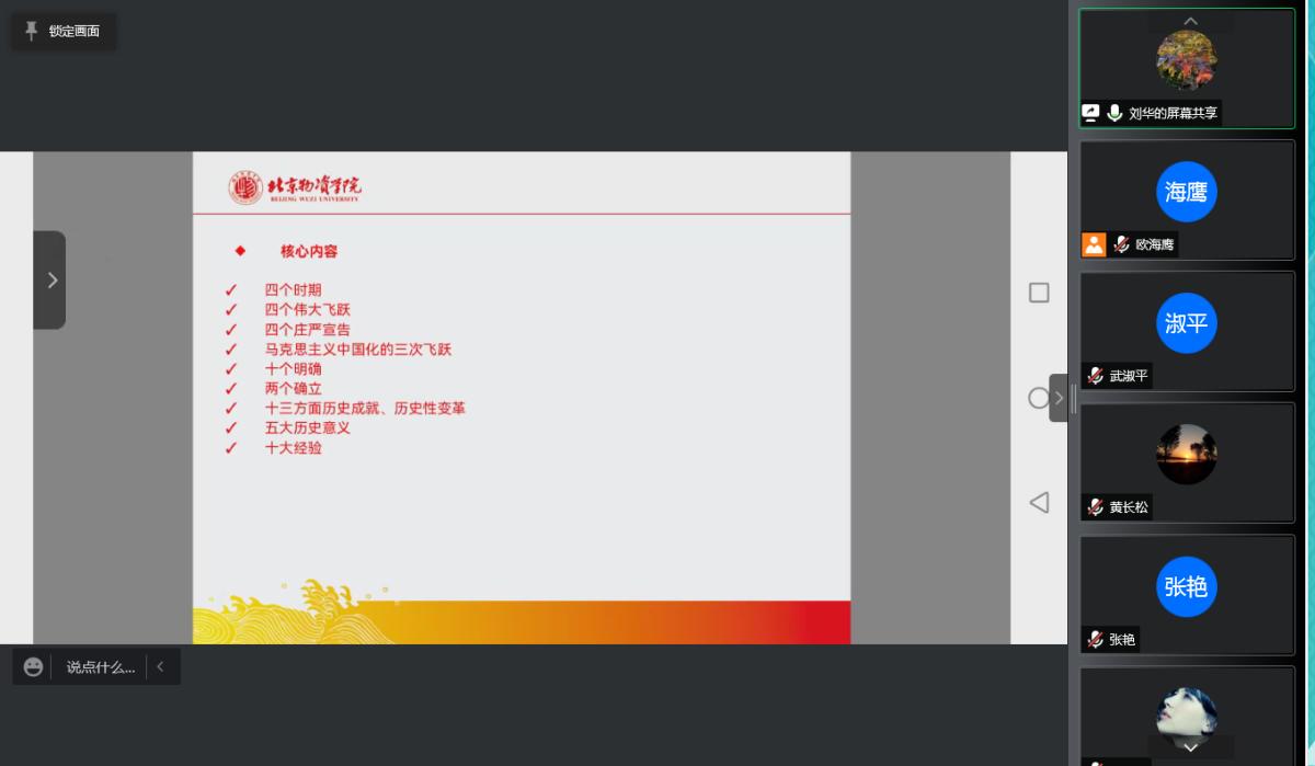 本次学习的主讲人刘华进行了重点导读,导读从《决议》出台的背景和意义出发,介绍了《决议》的主要结构,在此基础上,重点从:四个时期、四个伟大飞跃、四个庄严宣告、马克思主义中国化的三次飞跃、十个明确、两个确立、十三方面历史成就、历史性变革、五大历史意义、十大经验方面对《决议》的核心内容进行了解读。
