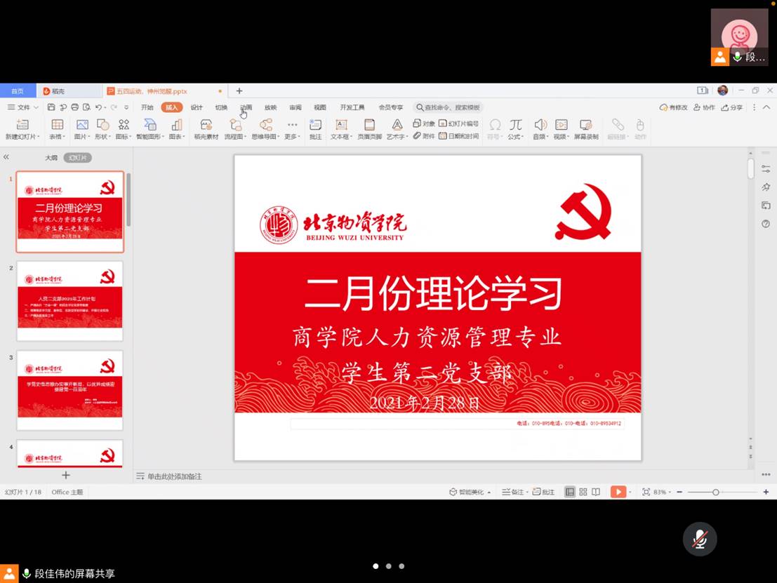 首先,段佳伟向我们简要介绍了支部2021年工作计划,对新学期党支部工作进行解读。紧接着,李然以《学党史悟思想办实事开新局,以优异成绩迎接建党一百周年》为主题展开了永利3044noc人力资源管理专业员工第二党支部理论学习。此次理论学习简要介绍了在北京召开的党史学习教育动员大会以及全国脱贫攻坚总结表彰大会,由党史中“五四运动“为切入点着重分享。五四运动,神州觉醒,李然同学从员工游行、学界宣言及北洋政府多角度向我们立体的还原五四运动的热血,让我们意识到五四运动是我们党史的开始,在革命先辈们血的奋战下,我们才能生活在一个祥和富饶的国家。