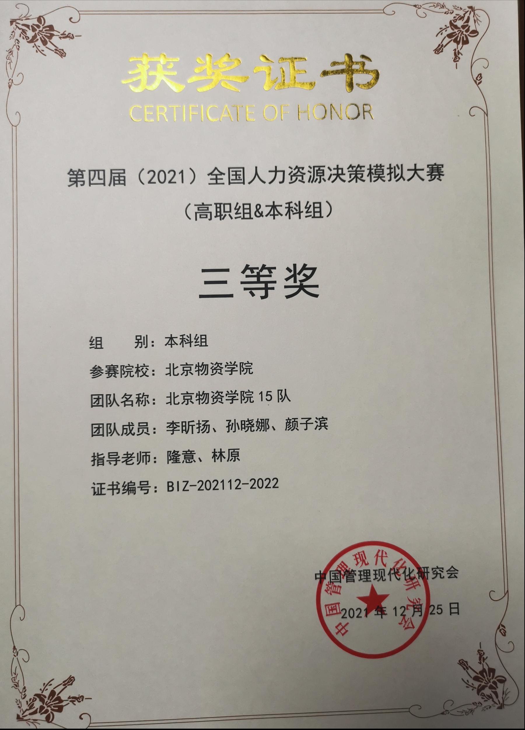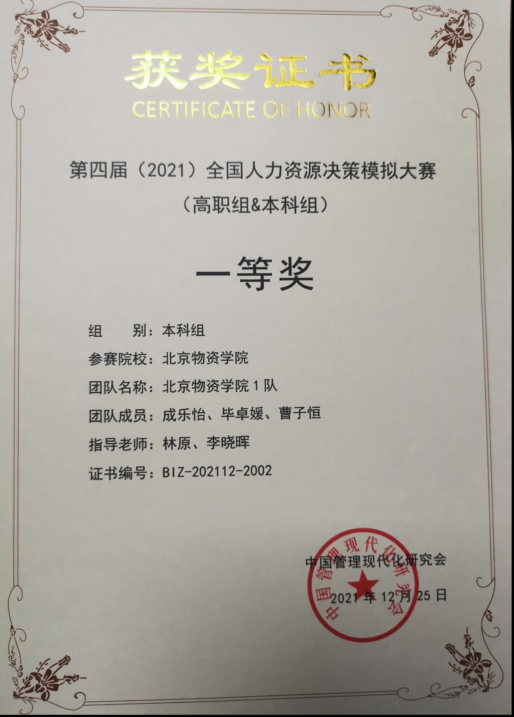 经过前期初赛选拔,公司共有20支队伍进入全国赛。比赛赛制为5+1,每支代表队的3名选手组建一个虚拟企业,扮演总经理、人力资源经理、招聘培训主管、薪酬绩效主管、生产与销售经理等岗位,就人力资源规划、薪酬设计、招聘、培训、人员调配、绩效管理、财务管理和运营管理等内容进行决策。决策过程要求选手综合分析本企业现状、历史状况、经营环境以及其它企业的信息,综合运用人力资源管理知识和方法,结合经济学基础、财务管理、运营管理等综合知识,发挥管理团队的集体智慧与创造精神,通过对企业人力资源的合理调配,达到企业长期效益最大化的目标。经过6期模拟经营,永利官网代表队获得一等奖1项,三等奖1项,获奖名单如下: