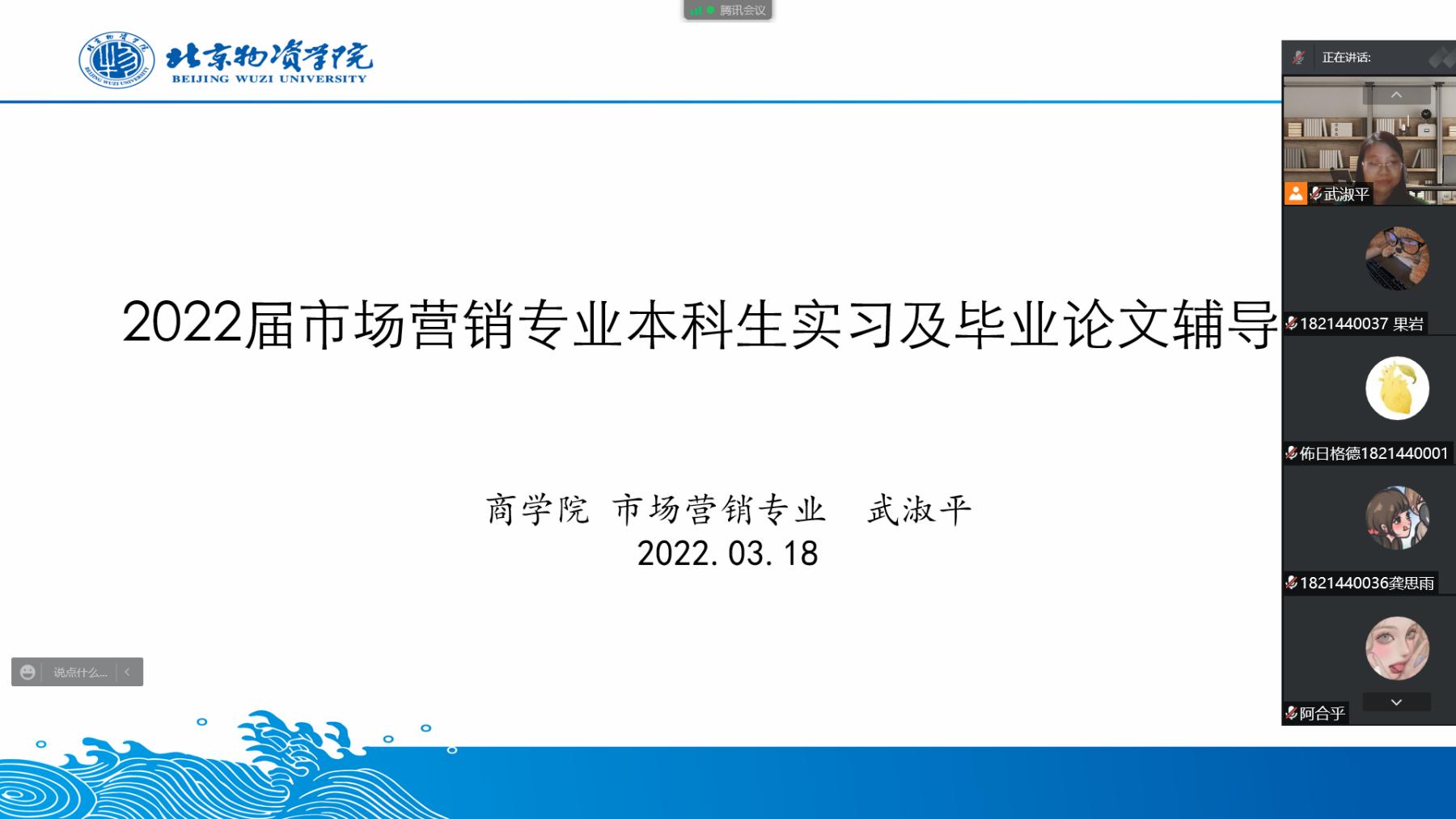 市场营销系主任武淑平老师首先对毕业实习和论文写作各阶段的任务及具体时间节点进行了说明。鉴于2022届的毕业实习工作接近尾声,武老师对需要同学们提交的实习日志、实习报告和实习鉴定表等文档的规范填写和需要注意的细节进行了详细说明。