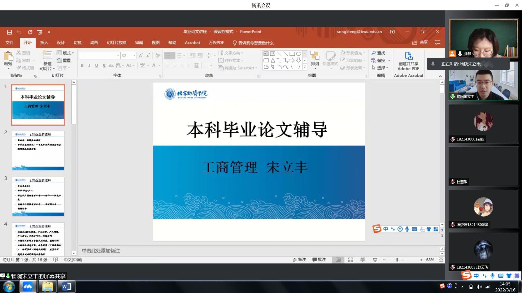 为提高工商管理本科毕业论文质量,解决员工在写作过程中遇到的一般性问题,3月16日下午工商管理系面向22届全体毕业生举行了毕业论文写作线上培训会。此次会议由工商系主任孙静副教授主持,宋立丰副教授主讲,全体2022届毕业生参加。