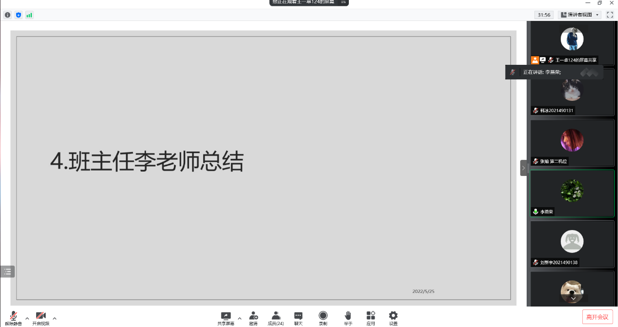 班主任李燕荣老师认真聆听了同学们的状况,询问了解了班级同学近况,并对下一步班级工作进行指导。她给同学们介绍和强调了高校防疫工作的重要性,鼓励同学们居家做好学习、身体锻炼、生活本领的提升,建议在安全的前提下做志愿社会服务。第二学年马上结束,专业分流已经完成,李老师建议同学们积极思考下一阶段的专业学习,做好学涯规划。班会在轻松的氛围中结束。