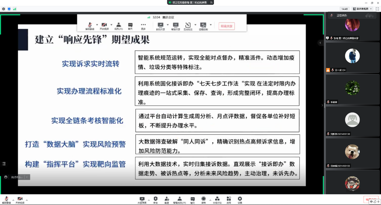 会上,班级同学结合挑战杯创业赛参赛情况,由挑战杯获奖组组长张瑜同学展示项目组的优秀答辩视频,分享项目经验和成功的喜悦。在李燕荣老师和杨柳依依老师的指导下所完成的《响应先锋--大数据下接诉即办三率问题的"指明灯" 》项目,张思宇同学所在团队在2022年“挑战杯”首都老员工创业计划竞赛专项赛道喜获银奖。学习交流中,张思宇同学的优秀答辩技术让同学们获益良多。