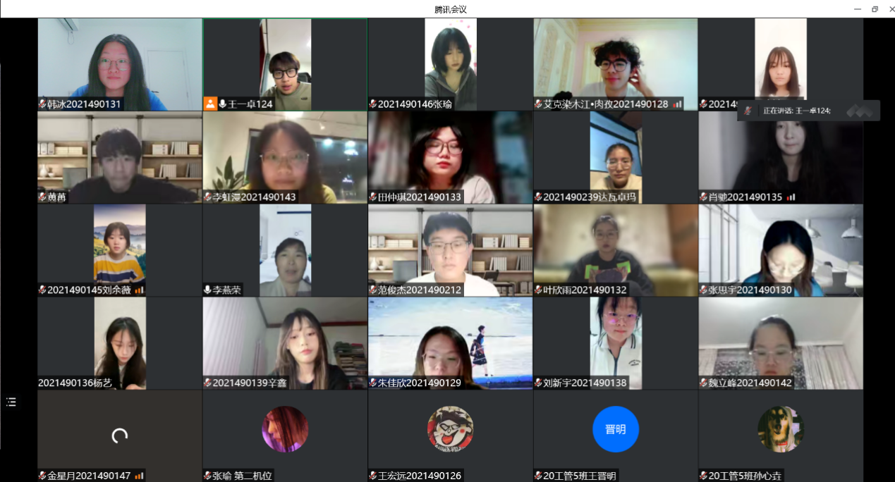 首先,班长王一卓汇报班级同学的防疫情况,并讲述了自己在防疫中的小趣事,让同学在抗击疫情的同时,稳住自己的心态,积极面对疫情。同时汇报了本班的学习状况,分析了网课期间同学们学习中存在的问题,汇总分析了部分课程的期中考试成绩,提醒同学们认真准备期末考试、不放松学习主业。