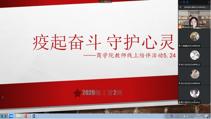 当前北京疫情防控形式仍处于严峻的状态,由于疫情这个学期同学们无法返回学校进行线下学习,为缓解同学们在疫情严峻下的心理状态,20级工管2班积极响应公司党委发起的“疫起奋斗,守护心灵”永利3044noc线上陪伴活动,于2022年5月24日下午,由工商管理系主任、20级工管2班班主任孙静老师和20级工管2班全体同学参加此次主题班会。