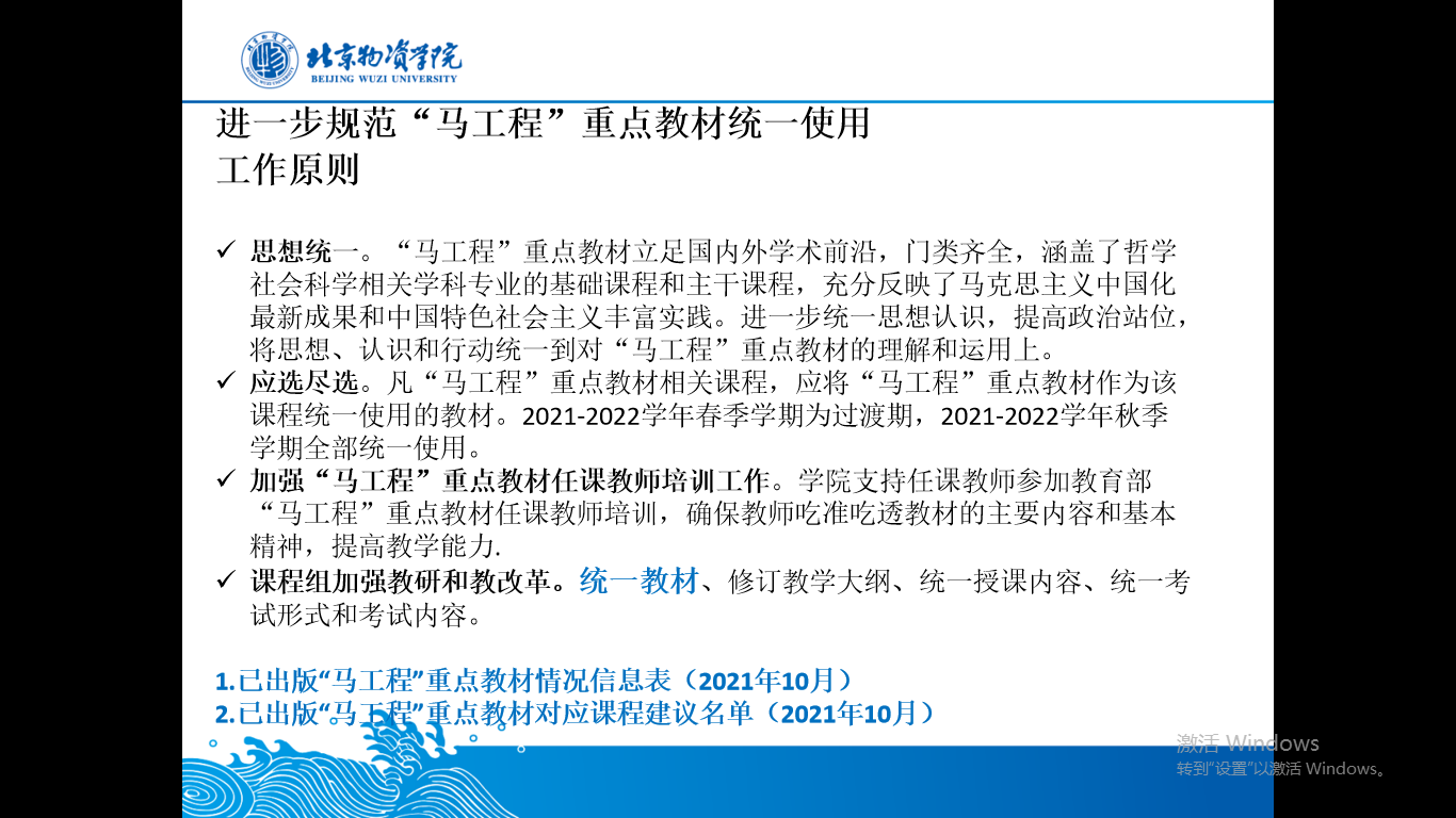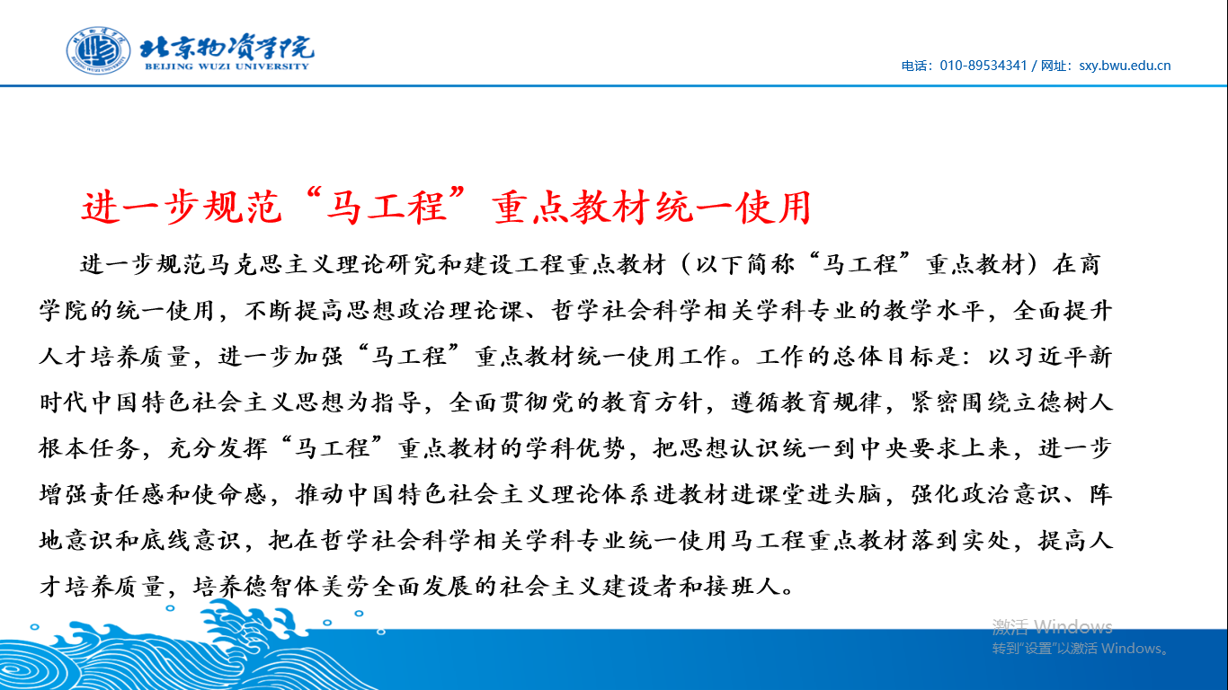 “马工程”重点教材立足国内外学术前沿,门类齐全,涵盖了哲学社会科学相关学科专业的基础课程和主干课程,充分反映了马克思主义中国化最新成果和中国特色社会主义丰富实践。公司党委对此工作非常重视,在2021-2022学年春季学期,已指导相关课程组选用”马工程”重点教材。2021-2022学年秋季学期,永利3044noc所有“马工程”重点教材相关课程,全部将“马工程”重点教材作为该课程统一使用的教材。同时,将进一步修订和完善课程教学大纲、统一授课内容、统一考试形式和考试内容,永利3044noc“马工程”重点教材使用工作得到进一步推进。