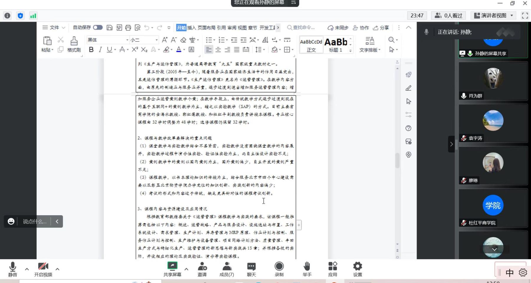 首先,《运营管理》《战略管理》《企业ERP系统SAP(双语)》《项目管理理论与实践(双语)》《现代流通概论》5门课程的负责人按照教务处要求,从课程内容、课程目标、课程资源及应用情况、课程特色与创新等角度对课程建设相关问题进行了汇报。吕波经理根据任务书的要求对5门课程一一进行了点评,并从专业建设、内容优化、课程团队、成果积累等方面进行了总结与经验分享。院教指委成员杜红平副教授从文本撰写、体例规范、教学成果整合等方面提出了切实有效的修改方法。魏国辰教授、金海水教授也结合自身教学经验,对部分课程的理论与实践设计、特色与成果培育等提出了中肯的建议。