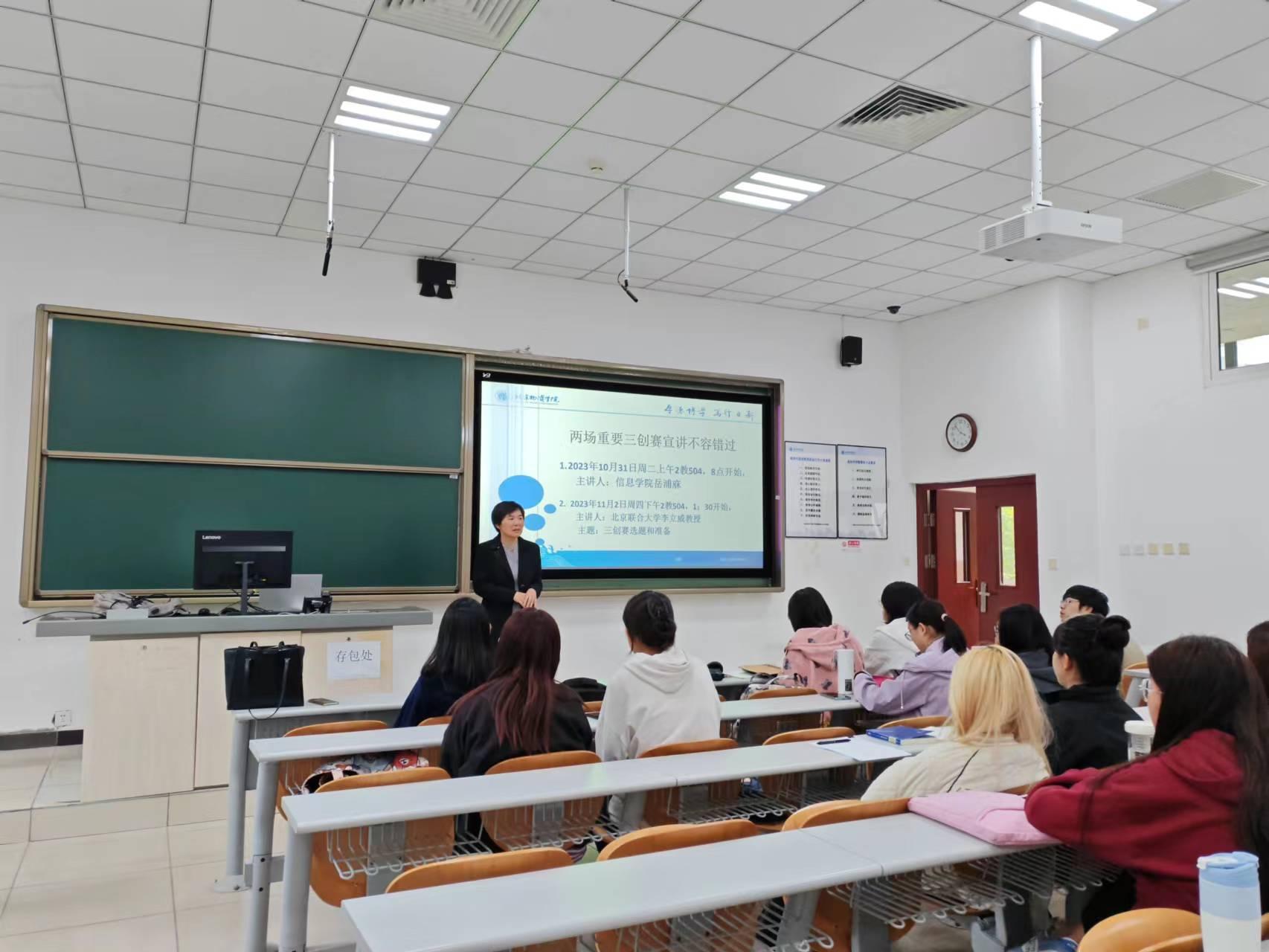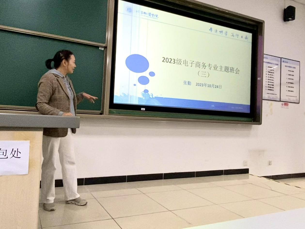 2023年10月24日,由张勤老师发起、带领2023电子商务同学共同举办“第三次电子商务专业主题班会”和“赛事社团成立商议会”。会议以线下形式召开,会议的第一阶段,张勤老师作为主讲老师向员工们介绍了全国普通高校学科竞赛排行榜竞赛的项目,着重讲解了电子商务的“三创挑战赛”,大大激发23级电子商务新生的兴趣。