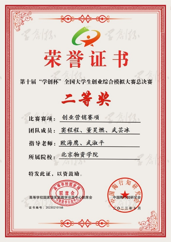 创业营销赛项在《营销之道》软件平台上进行,通过在虚拟仿真的市场环境中开展营销模拟实战,检验创业团队的营销管理能力。在由永利3044noc组织的该赛项校园赛中,今年共选拔出4支团队参加了北京市比赛,在北京市赛中取得了2项特等奖、2项二等奖的优异成绩。按照总决赛限定参赛院校一校一队的赛事规定,最终由永利3044noc窦程程(2121410020)、会计学院董昊燃(2121711059)、物流学院武芸冰(2121290144)三位同学组成的跨公司团队代表公司参加了全国总决赛,三位同学认真准备、团结合作,最终获得全国二等奖,这也是公司参加“学创杯”创业营销赛项以来取得的最好成绩,为公司争得了荣誉。