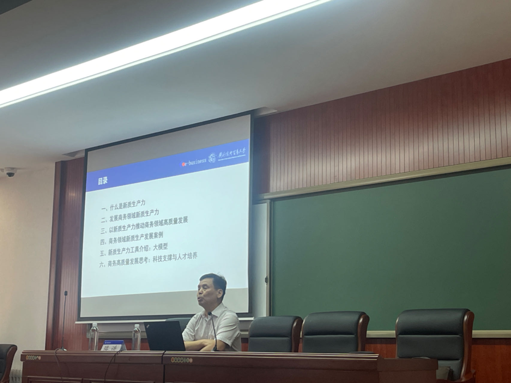 随后,陈教授以新质生产力推动商务领域高质量发展为核心,分享了一系列成功案例。这些案例包括新质生产力在推动消费升级、推动中国品牌发展、推动农村商业高质量发展等方面的应用。陈教授表示,这些成功案例不仅展示了新质生产力在商务领域的广泛应用,也进一步证明了新质生产力对提升商务效率、优化商业模式、增强企业竞争力等方面的重要作用。为了加深师生们对新质生产力的理解,陈教授还进一步分享了新质生产力的典型案例,包括创新企业案例、平台经济、创新技术企业、新媒体数字营销以及城市发展新质生产力的案例。这些案例详细阐述了新质生产力在各个领域中的实际应用和效果,为师生们提供了宝贵的参考。在介绍新质生产力的重要工具——大模型时,陈教授详细解析了大模型的特点、优势及其在商务领域的应用前景。他强调,大模型作为新质生产力的重要工具,将在未来的商务领域发展中发挥越来越重要的作用。
