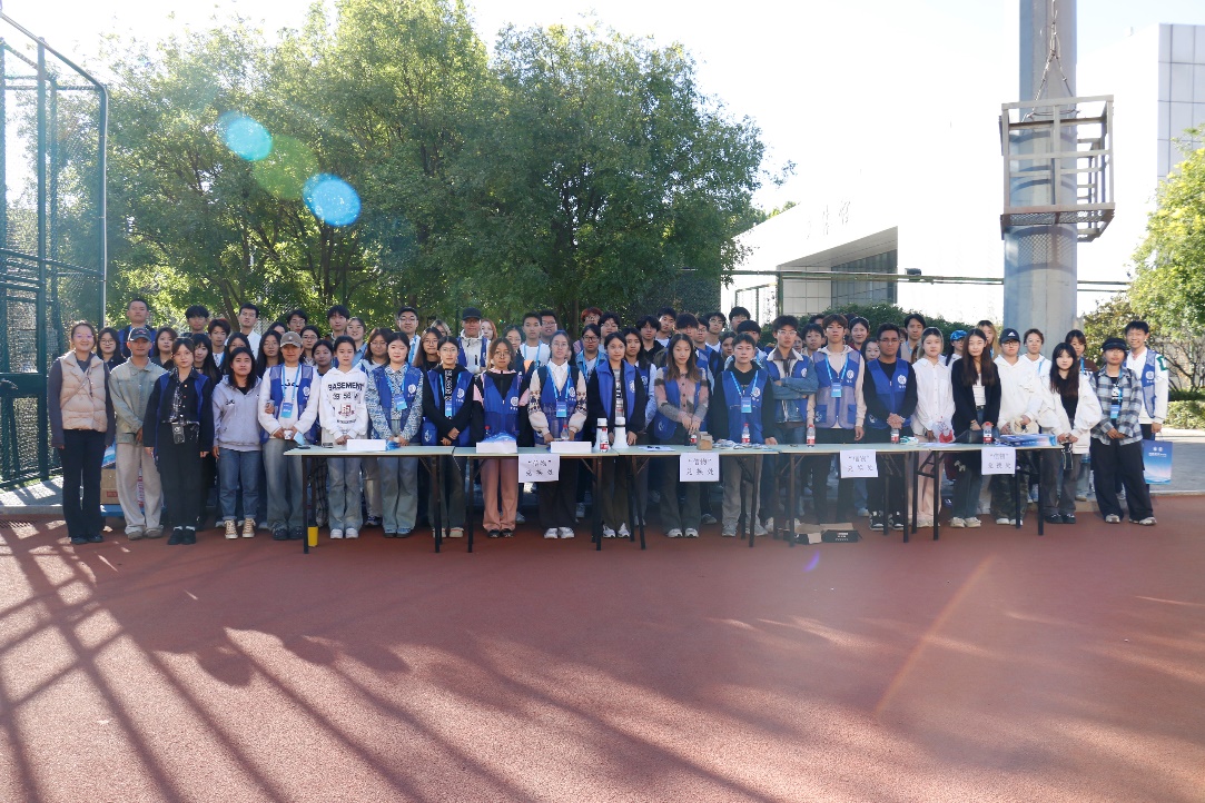 第一队以图书馆为起点,途经网球场、假山等地,设置了“湘江之战”“四渡赤水”“遵义会议”“飞夺泸定桥”四站,各站点设立了打卡贴纸,路上隐藏着红丝巾,这些沿途的长征“信物”,使这场徒步活动充满了惊喜与趣味。队伍前方高举着的旗帜让人不禁回望那段以鲜血与生命为新中国奠基的艰辛岁月,跨越时空,历久弥新。