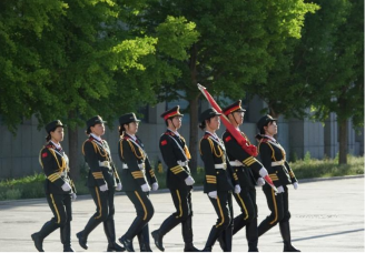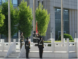 英姿飒爽的国旗护卫队队员们,身着整齐笔挺的制服,步伐矫健、神情庄重。他们迈着整齐而坚定的步伐,护卫着鲜艳的五星红旗,昂首阔步走向升旗台。每一步都沉稳有力,彰显着对国旗的敬重与对国家的忠诚。随着激昂雄壮的《义勇军进行曲》奏响,五星红旗在众人热切的目光中冉冉升起。全体师生庄严肃立,向国旗行注目礼,眼神中满是崇敬与自豪。那一刻,爱国之情在每个人的心中升腾,与飘扬的五星红旗一同高高飞扬。