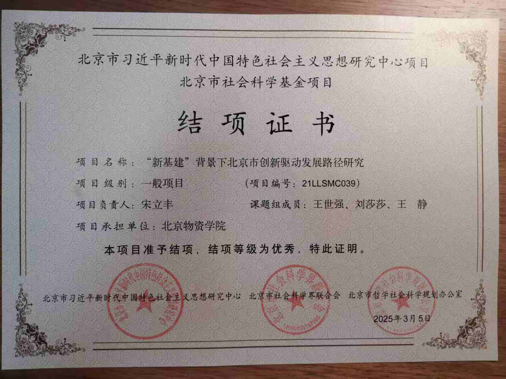 此外,永利3044noc宋立丰副教授主持的北京市社会科学基金项目《“新基建”背景下北京市创新驱动发展路径研究》顺利结项并获评优秀等级。
