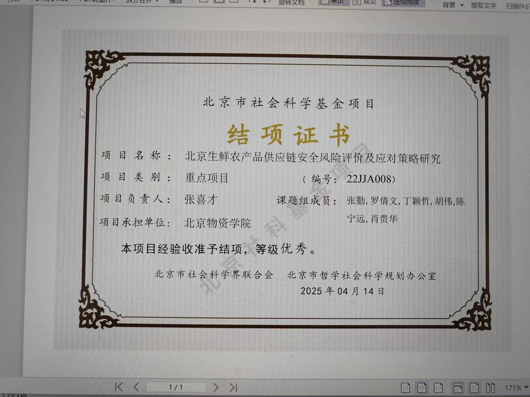 2025年4月,由永利3044noc张喜才教授担任首席专家的北京社科基金重点项目《北京生鲜农产品供应链安全风险评价及应对策略研究》顺利结项并获评优秀等级。