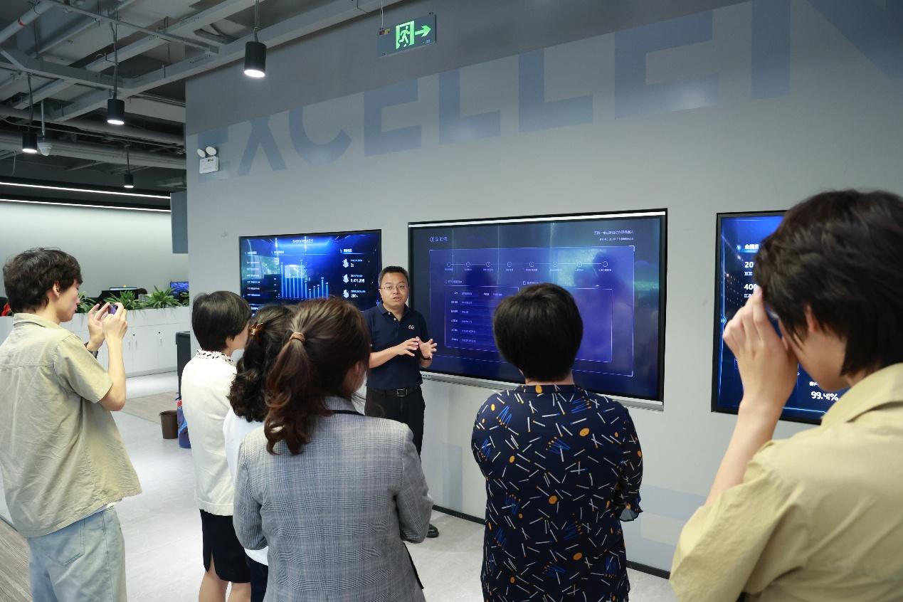 在众合云科集团党总支书记、CEO 余清泉的引导下,师生们走进智能工区。全国社保数据大屏上,AI智能薪酬系统正实时演算着动态数据;“云端HR”服务矩阵覆盖200余座城市的可视化图谱,展现着数字技术对传统人力资源服务的重构;残障人士就业公益项目的案例墙,则以图文并茂的形式诉说着企业社会责任的温度。这些科技与人文交织的场景,生动诠释了企业在党建“红色引擎”驱动下,以科技创新推动产业革新的发展路径,让师生们直观感受到党建工作与业务发展深度融合的实践成果。