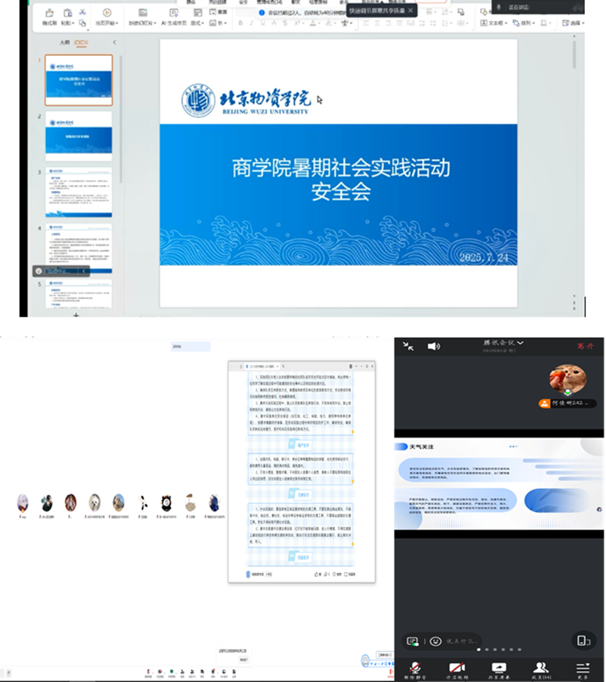 员工会对外联合实践部通过腾讯会议召开全院暑期社会实践团队安全专题培训会,同时各班召开班会,两个会议重点强调团队管理、安全责任、意识形态、人身安全、财产安全、交通安全、防暑降温及应急联络等重点工作,确保各实践团队统一思想,提高安全意识,聚焦团队协作中的相互关照义务,鼓励高年级党员、研究生在带领低年级及本科生实践过程中切实发挥安全监督与帮扶作用,将“党员带团员”、“高年级带低年级”的组织优势转化为坚实的安全保障。