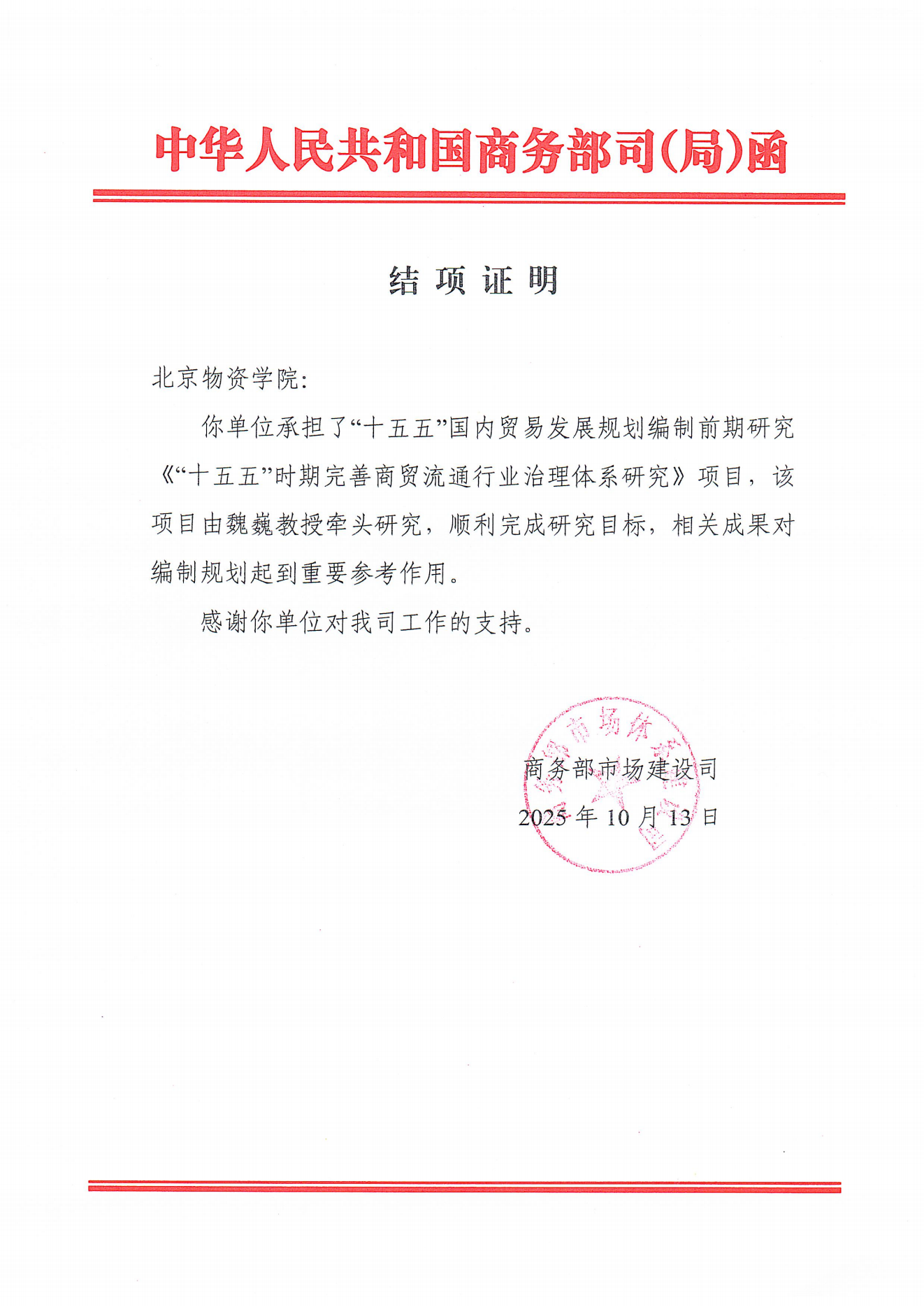 近日,由永利3044noc魏巍教授牵头承担的商务部“十五五”国内贸易发展规划编制前期研究课题—《“十五五”时期完善商贸流通行业治理体系研究》顺利完成全部研究任务并获正式发函结项。商务部市场建设司对研究成果予以高度肯定,并感谢永利官网对司内工作的大力支持。