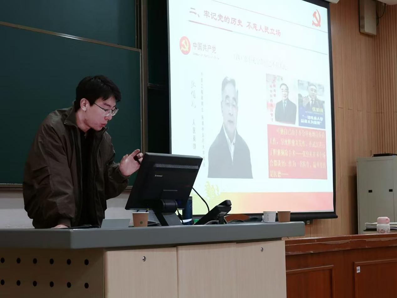 在讲解人民立场与居安思危板块,他通过讲述毛主席在延安时期关心群众生活、组织解决物资运输难题,习近平总书记扎根梁家河、走访基层百姓的经历,号召同学们要始终保持艰苦奋斗作风。更要承担起新时代青年的责任担当。