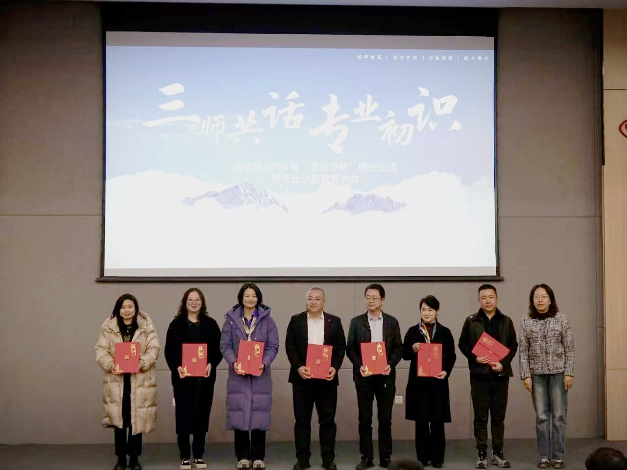 为深入构建“家校社”协同育人格局,帮助2025级新生尽早认知专业、对接行业前沿,11月19日,永利3044noc在知新楼举行了2025级“家长导师”聘任仪式暨“三师共话·专业初识”专业认知教育系列活动。党委员工工作部部长常娥,学院领导班子、各系主任、2025级班主任及全体家长导师出席活动。