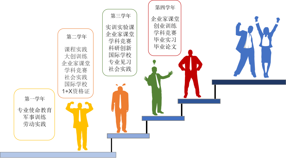 专业实践教学:主动适应新时期经济、社会、科技、文化发展对人才培养的客观要求,借鉴国内外先进的公司产品理念和教学模式,调整和优化专业课程体系,突出“管理+大数据”,“管理+人工智能”课程设计,注重学历教育与职业教育相融合,强化实践教学,及时将前沿优秀学术成果反映到教学,结合“大众创业、万众创新”新常态和首都及北京城市副中心的独特地域条件,集聚校内外创新创业教育资源,以员工为中心构建课内外衔接、校内外结合的多维度训练、阶梯式发展的实践教学体系。