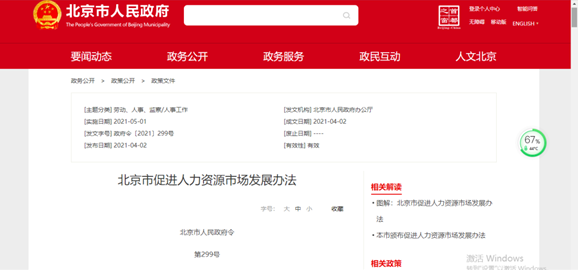 图2:北京市人民政府《北京市促进人力资源市场发展办法》(政府令〔2021〕299号,2021年4月2日发布)