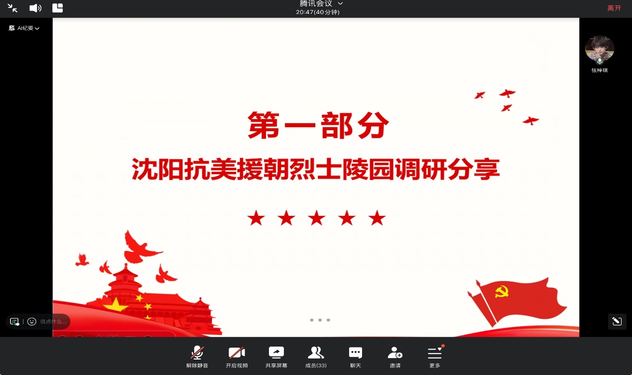最后,党员东海晴、张梓琪、任梦垚、卢海超、李岩、宋雨柯六位同志与大家分享了前往沈阳进行党建活动的调研心得。调研深入沈阳红色地标,开展“行走的思政课”。在与退伍老兵同志的深入交谈中,深刻体会到一名军人身上纯粹又崇高的爱国情;在沈阳中小员工博物馆讲解员的介绍中,切身感悟党建思政活动对培养理想信念的重要性。这些感悟将激励大家在今后的学习和工作中,坚定爱党报国信念,担当时代使命责任,将红色精神传承下去。