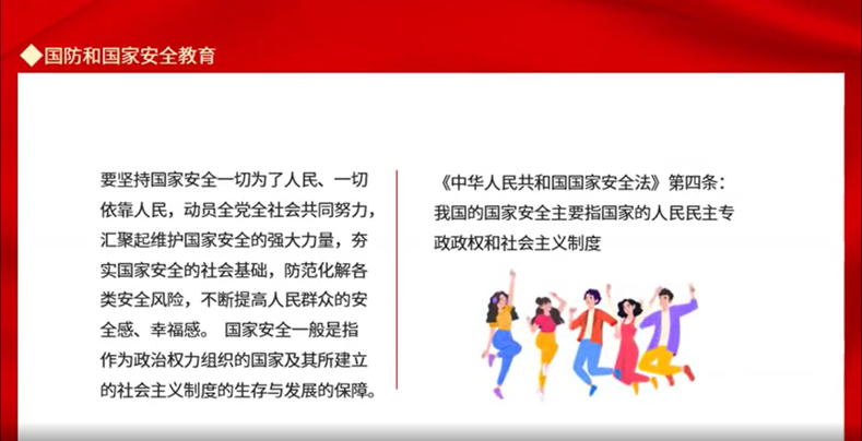 通过线上宣讲形式,为全体家庭经济困难员工讲解《中华人民共和国国家安全法》等法律知识,并采取以案释法的方式,对电信诈骗、危害国家安全等典型案例事例进行深入浅出的讲解,进一步增强了员工的国家安全意识,也进一步增强坚定维护和践行国家安全的主动性和自觉性。