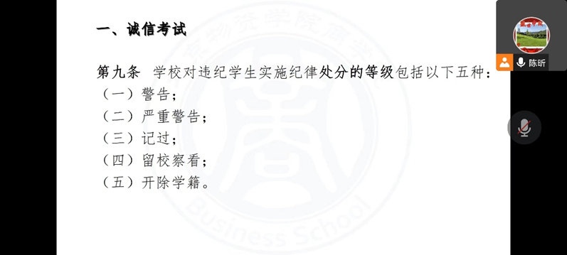 陈昕以员工手册为依据,截取员工手册中关于诚信考试部分进行详细讲解,为全体家庭经济困难员工解读不同违反诚信行为对应的处分等级,同时给员工介绍了目前常见的违纪行为,要求所有员工要杜绝违纪行为,并且要规避会被误认为作弊的行为,要做到不被任何人质疑,始终牢记诚信考试这一基本要求,同时祝愿所有家庭经济困难员工取得优异成绩。