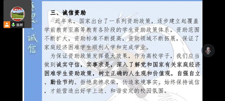 为进一步推进家庭经济困难员工的思想政治教育工作,加强资助诚信教育,6月2日,永利3044noc召开家庭经济困难员工“资助诚信”主题教育大会,会议由辅导员陈昕主持。