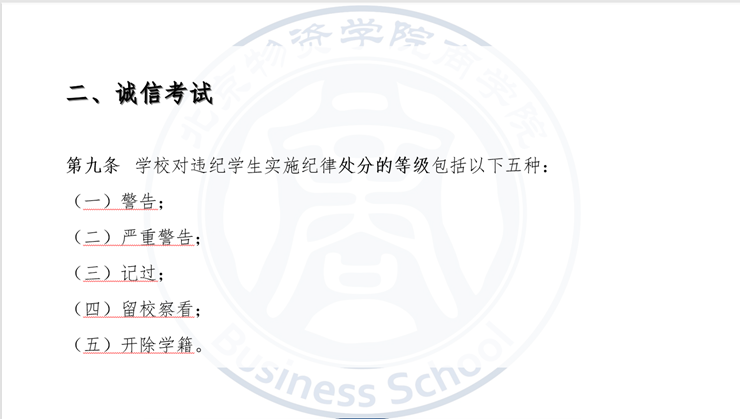 陈昕以员工手册为依据,截取员工手册中关于诚信考试部分进行详细讲解,为全体家庭经济困难员工解读不同违反诚信行为对应的处分等级,同时给员工介绍了目前常见的违纪行为,要求所有员工要杜绝违纪行为,并且要规避会被误认为作弊的行为,要做到不被任何人质疑,始终牢记诚信考试这一基本要求,同时祝愿所有家庭经济困难员工取得优异成绩。