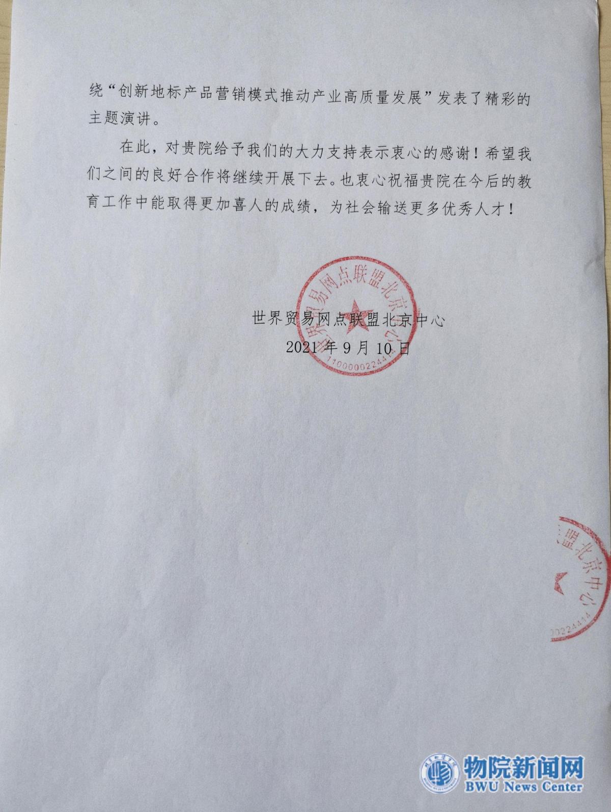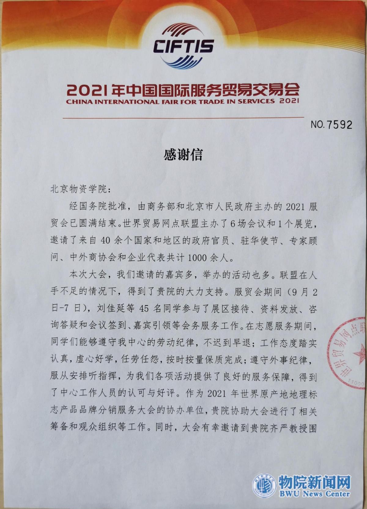 2021年9月10日,公司收到中国国际服务贸易交易会(以下简称服贸会)世界贸易网点联盟对公司齐严教授及志愿者团体发来的感谢信。信中对永利官网在2021年服贸会中的突出贡献表达了感谢之情,并表示永利3044noc45名志愿者在服贸会中提供了良好服务保障,得到了中心工作人员的认可和好评。信中感谢了永利3044noc齐严教授围绕“创新地标产品营销模式推动产业高质量发展”发表的精彩主题演讲,同时表达了希望与公司继续开展良好合作的愿景,也祝愿公司在今后的教育工作中能取得更加喜人的成绩,为社会输送更多优秀人才!