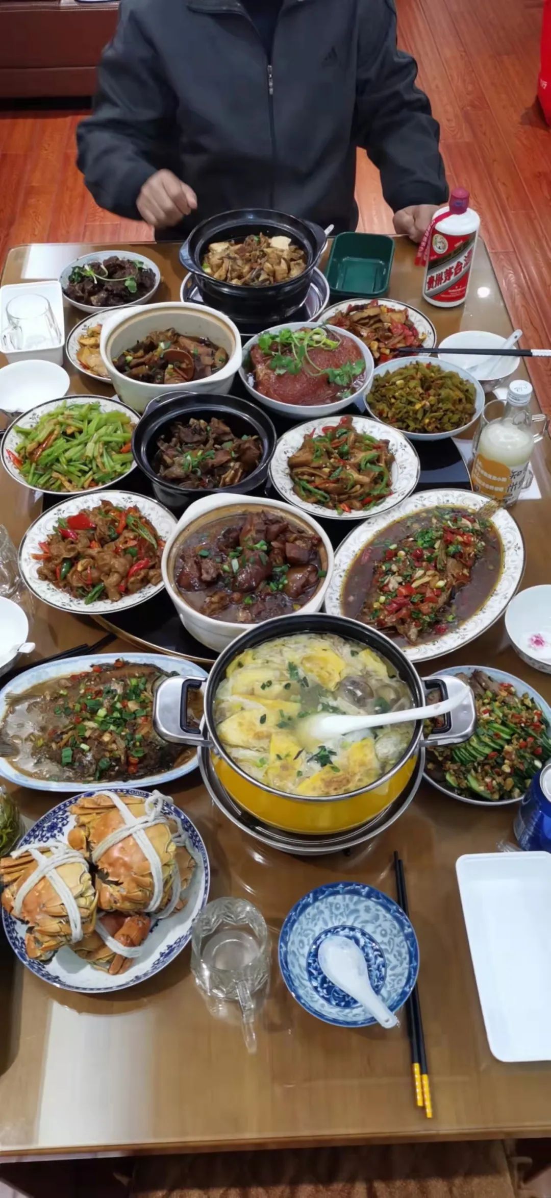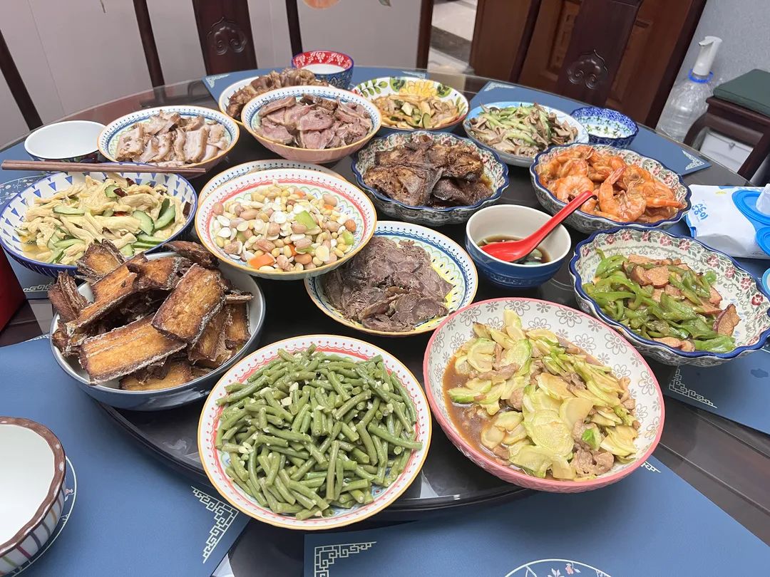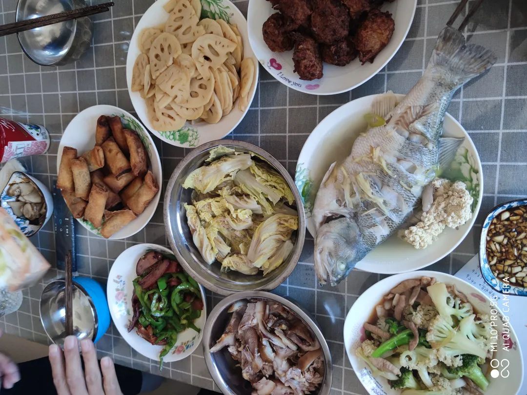 今天是除夕,这些是我的年夜饭,平平无奇的年夜饭,每年的年夜饭都差不多,每年炸的东西是必备的,炸茄盒炸春卷炸虾片炸蘑菇炸黄花菜,u1s1这些炸的我都很少吃因为好腻……再不就是凉菜,也是每年都有,因为姥姥爱吃这个。还有一个木耳炒菜花,emm这个不擦!这个适合我,菜花减肥神器哈哈!还有那个素东坡肉炒竹笋,素东坡肉好吃。一桌子的素菜真是太适合我这个不想发胖的人了hahaha就是miu极了!想到了那个炸春卷,有豆沙馅还有菜馅,我一直都觉得菜馅的春卷真好吃!