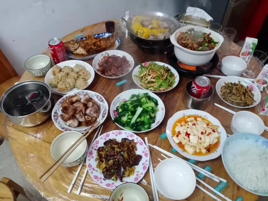 平时大妈不怎么做饭,但这次的年夜饭是大妈亲自做的,她还特地和合肥本地人学了炸丸子,但可能哪里失误了,只能做成蒸的了哈哈哈哈。年夜饭有糯米丸子、卤猪蹄、 麻婆豆腐、 红烧鲈鱼、玉米排骨汤、笋干牛肉火锅、腊肠、辣椒炒鸭肫、炒青菜、芹菜炒豆干等。今年是和大父、大妈、哥哥一起吃年夜饭,对于新年祝词,我这次早有准备、做足了功课,八方来财,紫气东来,虎年行大运,芝麻开花节节高,烦恼无忧常微笑!希望在新的一年,家人身体健康,平安顺遂,我学业顺利!