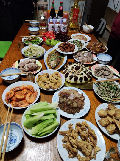 家人团坐,辞旧迎新,年夜饭的菜谱讲究吉祥如意。奶奶,叔叔做的菜可谓色香味俱全。清蒸鲈鱼,芥末虾球,炖鸡,炖排骨,炸丸子,鸡翅中,葱爆羊肉……当然也少不了素菜:炒彩椒,笋丝,地三鲜等。可谓是年年有余、富贵满堂、节节高升、五福临门、凤凰迎春……